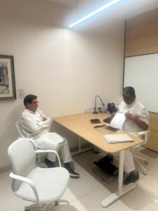 भवन की दीवारों पर अंकित ऐतिहासिक बिंदुओं को लेकर बी.के. हरिप्रसाद जी ने मुझसे चर्चा की। यह संवाद कैमरे में भी कैद हुआ। उनके कार्यालय में हम सबकी उपस्थिति रही, और उनका आत्मीय व्यवहार आज भी वैसा ही है जैसा पहले था।