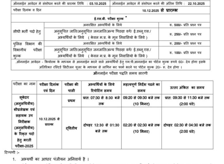 भोपाल। मध्यप्रदेश कर्मचारी चयन मंडल (MPESB) ने गृह विभाग के निर्देशानुसार सूबेदार, शीघ्रलेखक (Stenographer) और सहायक उप...